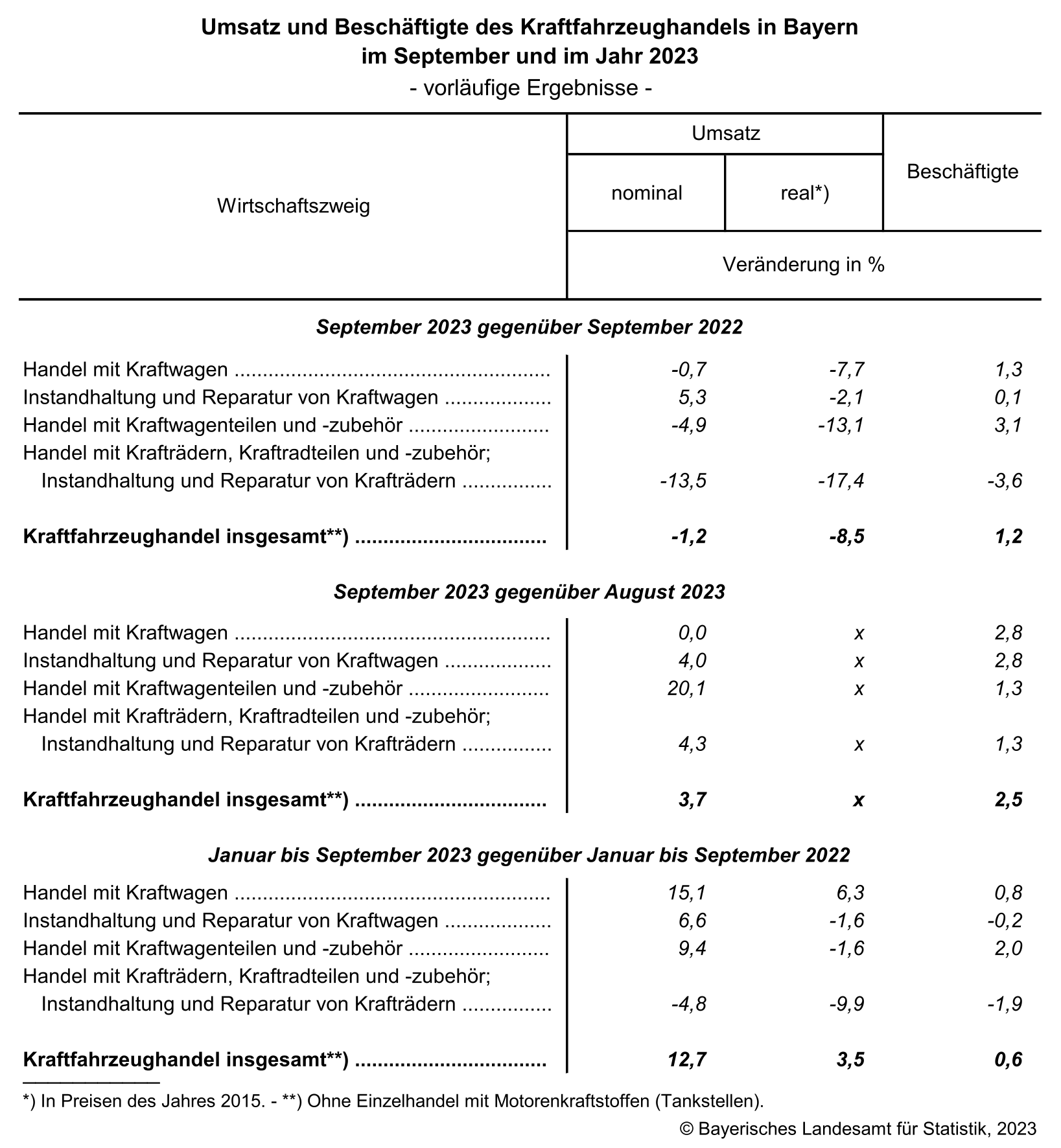 Umsatz und Beschäftigte des Kraftfahrzeughandels in Bayern im September und im Jahr 2023