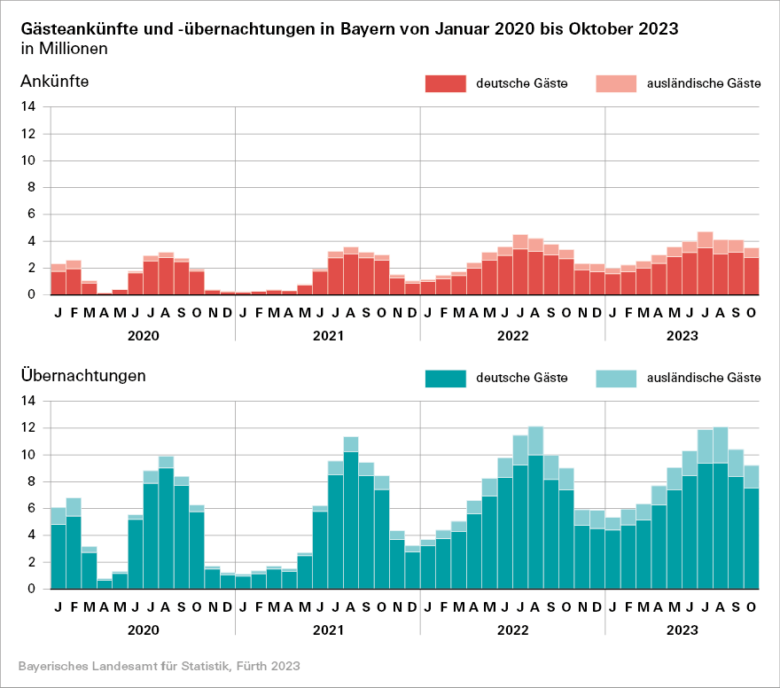 Ausführliche Ergebnisse enthält der in KW 49/2023 erscheinende Statistische Bericht „Tourismus in Bayern im Oktober 2023 (Bestellnummer: G4100C 202310)“. Weitere Informationen zum Bezug von Druckausgaben erhalten Sie beim Vertrieb per E-Mail (vertrieb@statistik.bayern.de), Telefon (0911 98208-6311) oder Fax (0911 98208-6638). Die Daten können ebenso über Genesis abgerufen werden: Bayerisches Landesamt für Statistik - GENESIS-Online: Statistik:  45511 (bayern.de)