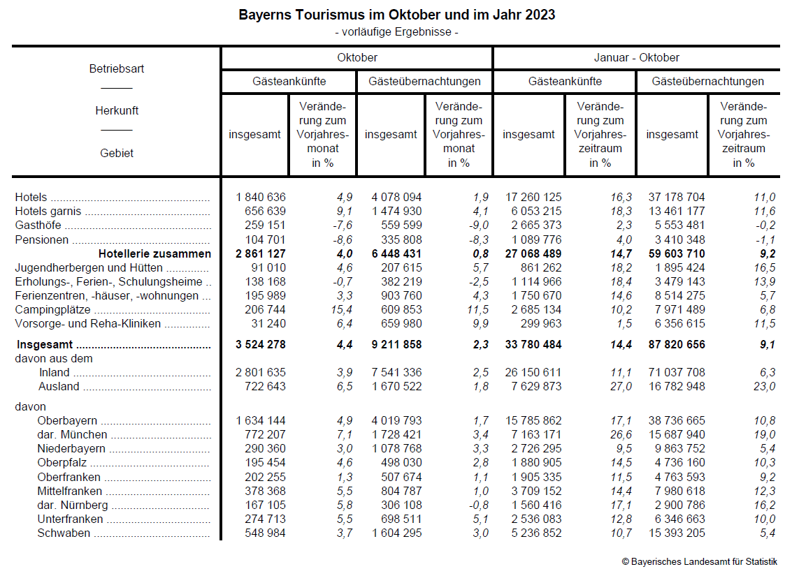 Schweinfurt. Im Oktober 2023 meldet das Fachteam des Bayerischen Landesamts für Statistik in den 11 456 geöffneten Beherbergungsbetrieben Bayerns rund 3,5 Millionen Gästeankünfte (+4,4 Prozent im Vergleich zum Vorjahresmonat) und gut 9,2 Millionen Übernachtungen (+2,3 Prozent im Vergleich zum Vorjahresmonat). Positiv entwickelt sich die Nachfrage nach bayerischen Beherbergungsangeboten dabei sowohl bei den inländischen Gästen (Gästeankünfte: +3,9 Prozent, Übernachtungen: +2,5 Prozent) als auch bei den Gästen aus dem Ausland (Gästeankünfte: +6,5 Prozent; Übernachtungen: 1,8 Prozent). Im Jahresverlauf von Januar bis Oktober 2023 übersteigen sowohl die Gästeankünfte mit gut 33,8 Millionen (+14,4 Prozent), als auch die Übernachtungen mit rund 87,8 Millionen (+9,1 Prozent) die Ergebnisse des Vorjahreszeitraums 2022.