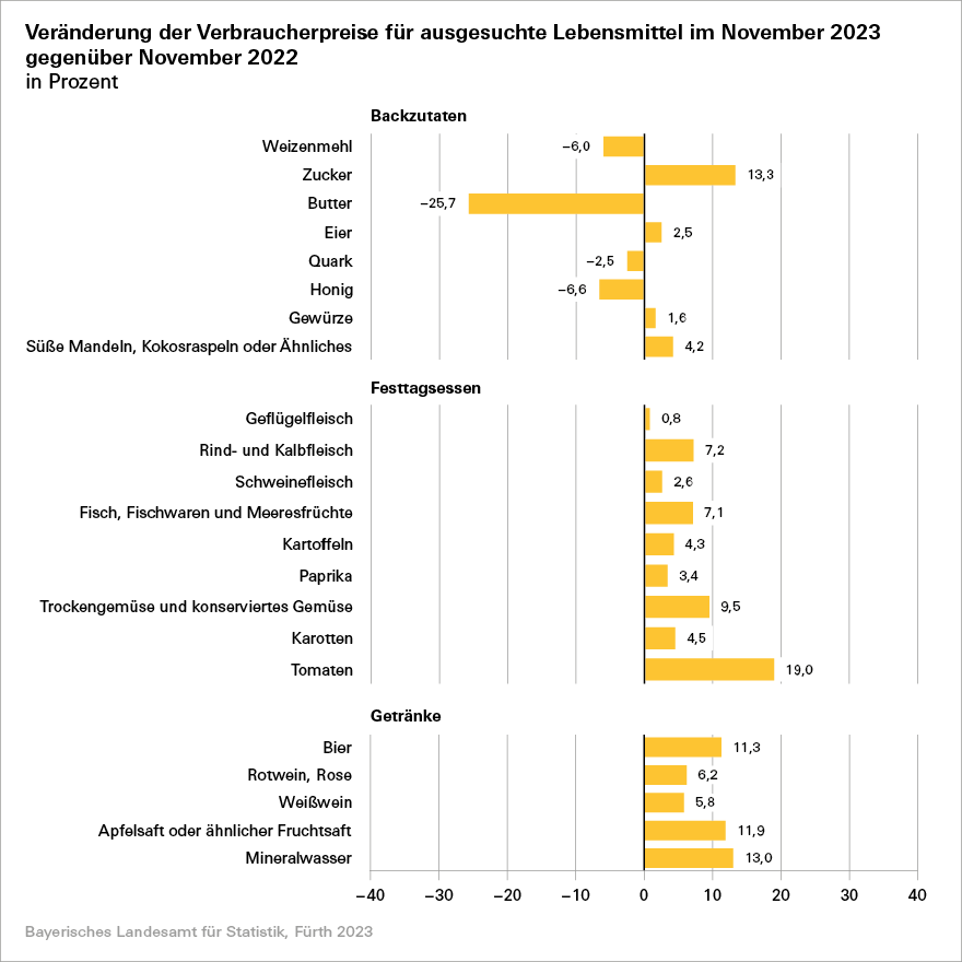 Für fleischhaltige Gerichte zum Beispiel mit Rind- und Kalbfleisch (+7,2 Prozent), Schweinefleisch (+2,6 Prozent) oder Geflügelfleisch (+0,8 Prozent) müssen die Verbraucherinnen und Verbraucher mehr als noch im Jahr zuvor bezahlen. Ebenfalls teurer wird der in manchen Regionen beliebte Weihnachtskarpfen. Die Preise von Fisch, Fischwaren und Meeresfrüchte sind mit +7,1 Prozent im Vergleich zum November 2022 spürbar gestiegen. Gleiches zeigt sich beim Gemüse. Vor allem Tomaten als beliebtes Gemüse legen um +19 Prozent im Vergleich zum Vorjahresmonat zu. Auch Trockengemüse und konserviertes Gemüse (+9,5 Prozent), Kartoffeln (+4,3 Prozent), Möhren (+4,5 Prozent) und Paprika (+3,4 Prozent) sind teurer.