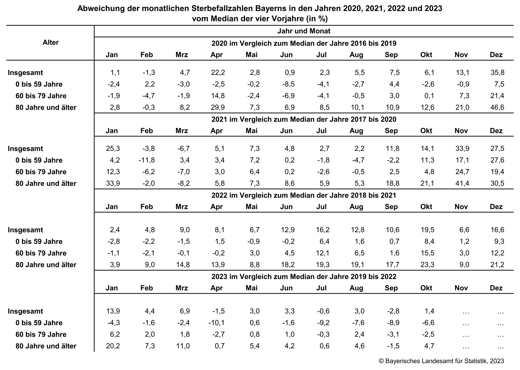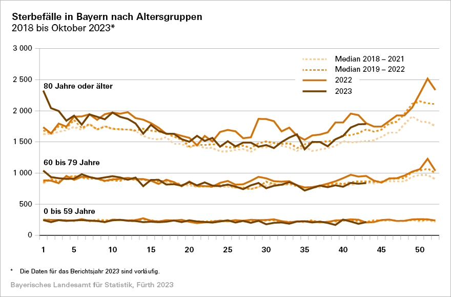 Fürth. Wie das Expertenteam des Bayerischen Landesamts für Statistik nach Auswertung vorläufiger Daten mitteilt, liegt die Zahl an Verstorbenen im Freistaat im Oktober 2023 mit 12 213 Personen insgesamt auf ähnlichem Niveau wie der Median der Jahre 2019 bis 2022 (12 047 Verstorbene).