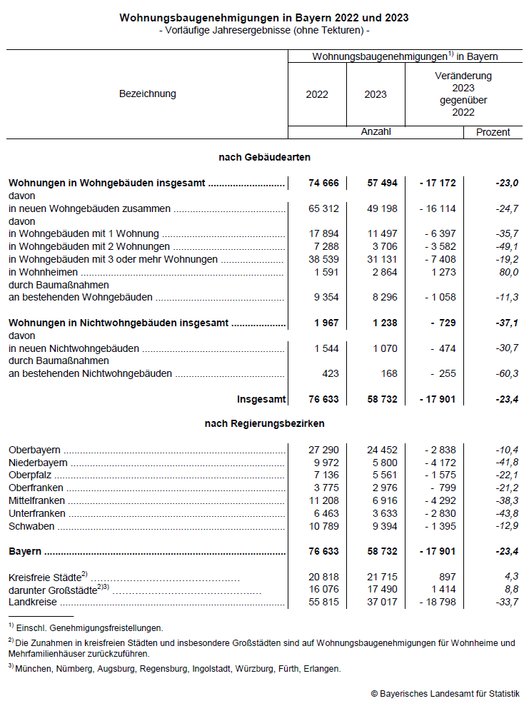 Schweinfurt. Nach vorläufigen Ergebnissen der amtlichen Baugenehmigungsstatistik werden in Bayern im Jahr 2023 insgesamt 58 732 Wohnungsbaugenehmigungen (einschließlich Genehmigungsfreistellungen) erteilt. Nach Auskunft der Fachgruppe im Bayerischen Landesamt für Statistik ist die Zahl der zum Bau freigegebenen Wohnungen um 17 901 beziehungsweise 23,4 Prozent gegenüber dem Vorjahreszeitraum zurückgegangen.