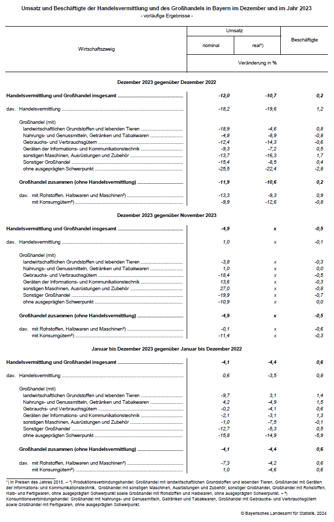 Im Dezember 2023 sinkt der nominale Umsatz des Großhandels (einschl. der Handelsvermittlung) gegenüber dem Dezember 2022 um 12,0 Prozent und der reale Umsatz um 10,7 Prozent. Die Beschäftigtenzahl steigt um 0,2 Prozent. Im Vergleich zum Vormonat geht der nominale Umsatz im Dezember um 4,9 Prozent zurück. Die Beschäftigtenzahl nimmt gegenüber dem November um 0,5 Prozent ab.