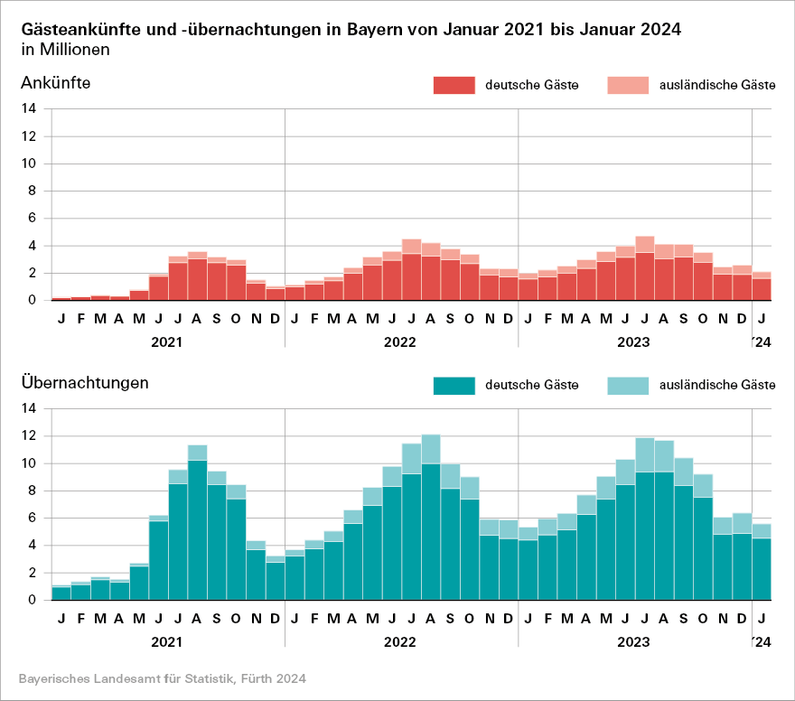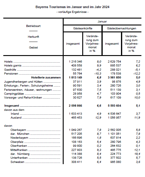 Wie das Bayerische Landesamt für Statistik nach den vorläufigen Ergebnissen der Monatserhebung im Tourismus mitteilt, steigt in den bayerischen Beherbergungsbetrieben die Anzahl der Gästeankünfte im Januar 2024 um 6,6 Prozent zum Vorjahresmonat auf rund 2,1 Millionen. Die Übernachtungszahlen verzeichnen ebenfalls ein Plus von 5,1 Prozent auf knapp 5,6 Millionen.