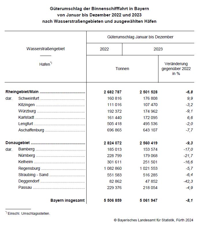 Im Jahr 2023 erzielen die bayerischen Binnenhäfen mit knapp 5,1 Millionen Tonnen Güterumschlag erneut ein schlechteres Ergebnis als im Vorjahr. Wie das Bayerische Landesamt für Statistik mitteilt, werden gegenüber dem Jahr 2022 um 8,1 Prozent weniger Güter verladen. Betroffen ist das Donaugebiet mit einem Rückgang um 9,3 Prozent auf rund 2,6 Millionen bzw. das Maingebiet mit rund 2,5 Millionen Tonnen und 6,8 Prozent weniger Güterumschlag. Die umschlagstärksten Häfen an der Donau sind Regensburg und Straubing-Sand, am Main sind dies Aschaffenburg und Lengfurt.