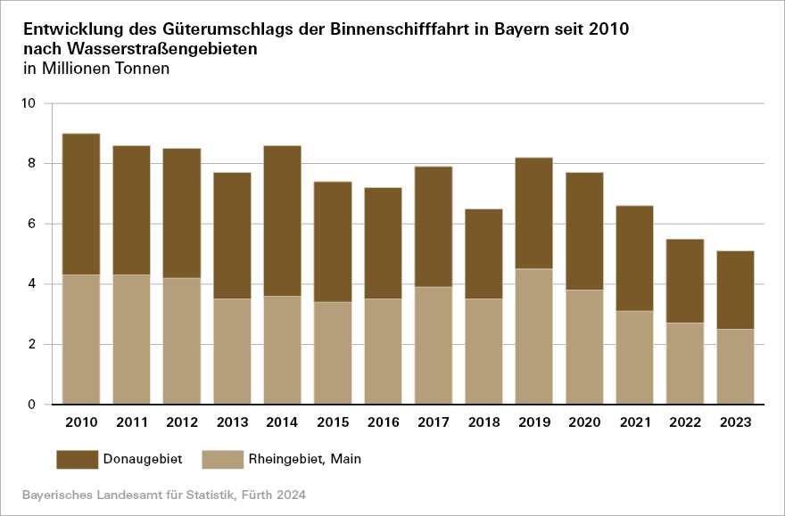 Betroffen von dieser Entwicklung ist das Donaugebiet mit einem Rückgang um 9,3 Prozent auf knapp 2,6 Millionen Tonnen. Im Maingebiet werden mit rund 2,5 Millionen Tonnen um 6,8 Prozent weniger Güter als noch im Vorjahr ein- und ausgeladen. Die Verteilung im Jahr 2023 ist mit einem Anteil des Donaugebietes am bayerischen Güterumschlag von 50,6 Prozent zu 49,4 Prozent auf dem Main nahezu ausgewogen.