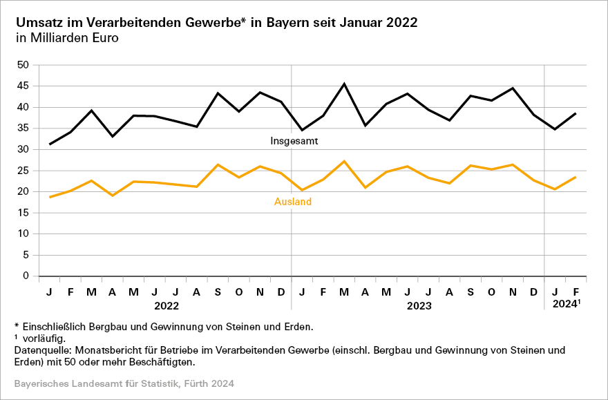 Das Verarbeitende Gewerbe Bayerns verzeichnet im Februar 2024 gegenüber dem Vorjahresmonat einen nominalen Umsatzzuwachs von 1,6 Prozent auf rund 38,6 Milliarden Euro. Nach Feststellung des Bayerischen Landesamts für Statistik nehmen die Auslandsumsätze im selben Zeitraum um 3,0 Prozent auf rund 23,5 Milliarden Euro zu. Die Exportquote beträgt 61,0 Prozent. Die Umsätze mit den Ländern der Eurozone steigen um 1,4 Prozent, ihr Anteil am Gesamtumsatz beläuft sich auf 19,5 Prozent. Die Nachfrage nach bayerischen Industriegütern nimmt preisbereinigt um 10,7 Prozent ab.