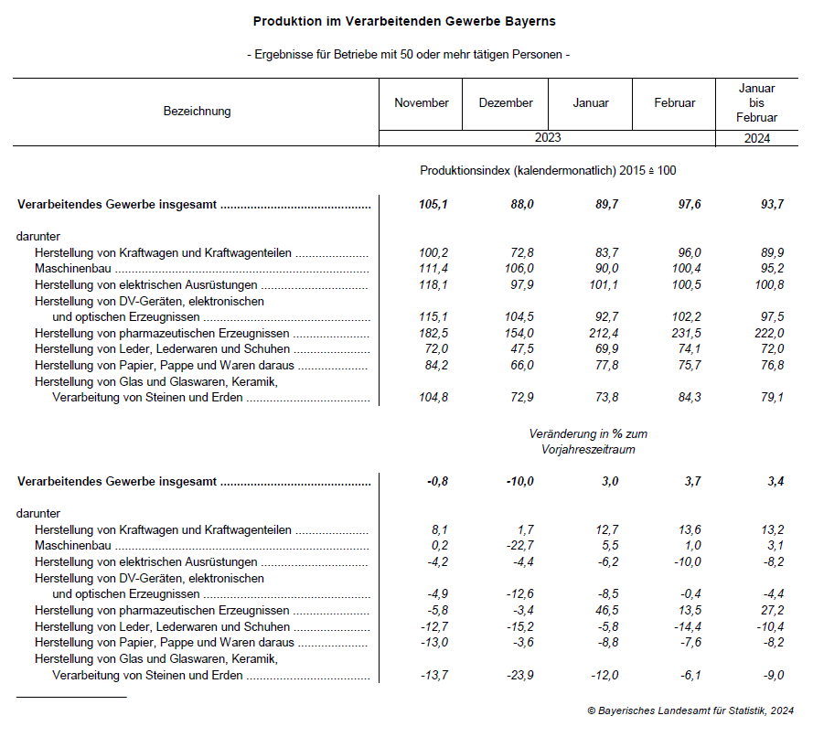 Nach Angaben des Bayerischen Landesamts für Statistik verzeichnet die Produktion des Verarbeitenden Gewerbes in Bayern im Februar 2024 eine Zunahme von 3,7 Prozent gegenüber dem Vorjahresmonat. Die ersten beiden Monate des Jahres 2024 ergeben ein Plus von 3,4 Prozent. Vor allem die Pharmaindustrie, aber auch die Kraftfahrzeugbranche steigern in diesem Zeitraum ihre Produktionstätigkeit deutlich.