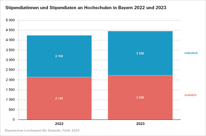 Im Jahr 2023 werden in Bayern 4 458 Studierende mit dem seit 2011 vergebenen Deutschlandstipendium gefördert. Wie das Bayerische Landesamt für Statistik mitteilt, studieren zwei Drittel (66,0 Prozent) der so Geförderten an Universitäten. Genau die Hälfte der Deutschlandstipendien (50,0 Prozent) wird an Studentinnen vergeben.