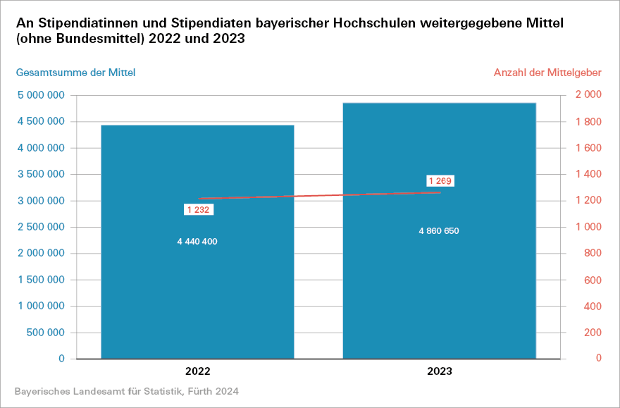 Für das Jahr 2023 beträgt die Gesamtsumme der an die Stipendiaten weitergegebenen Mittel (ohne Bundesmittel) 4,9 Millionen Euro (Vorjahr: 4,4 Millionen Euro). Die Zahl der privaten Mittelgeber steigt um 37 auf insgesamt 1 269.