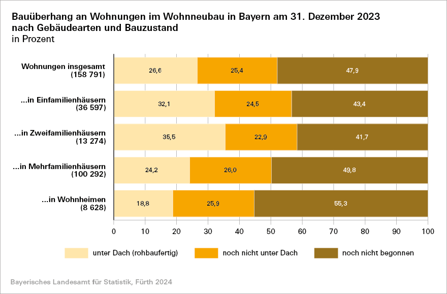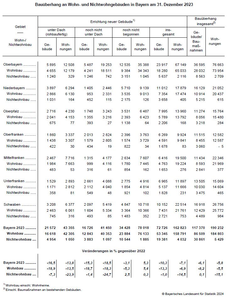 Nach Mitteilung des Bayerischen Landesamts für Statistik liegen in Bayern am 31. Dezember 2023 für insgesamt 190 232 zum Bau genehmigte Wohnungen noch keine Fertigstellungsmeldungen vor. Im Vergleich zum Vorjahr schrumpft der Bauüberhang demnach um 11 761 Wohnungen beziehungsweise 5,8 Prozent. Bei 47,9 Prozent der Wohnungen im Wohnneubau ist Ende 2023 noch kein Baubeginn registriert. Bereits in der Bauphase, aber „noch nicht unter Dach“, sind 25,4 Prozent der entsprechenden Wohnungen. Am weitesten fortgeschritten mit dem Bauzustand „unter Dach“ sind 26,6 Prozent der Wohnungen. Nach Gebäudearten betrachtet, ist mit 35,5 Prozent der Anteil an rohbaufertigen Wohnungen bei Zweifamilienhäusern am größten.