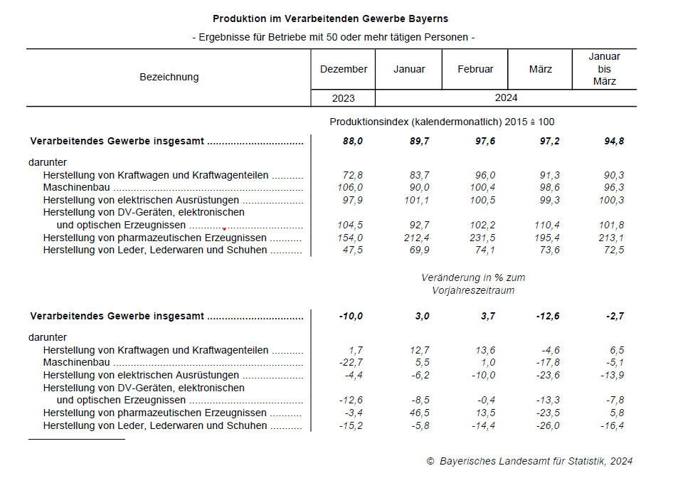 Produktion des Verarbeitenden Gewerbes in Bayern im März 2024 um 12,6 Prozent unter Vorjahresniveau