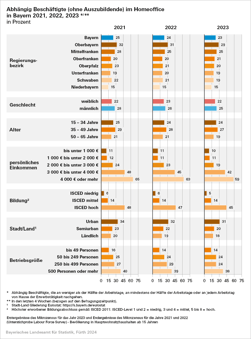 Oberbayern mit der Landeshauptstadt München hat bayernweit mit 29 Prozent den höchsten Homeoffice-Anteil. In Niederbayern arbeiten die wenigsten Beschäftigten aus dem Homeoffice. Der Anteil liegt hier bei 15 Prozent. Die Regierungsbezirke Mittelfranken (25 Prozent), Unterfranken (21 Prozent), Oberfranken (20 Prozent) sowie Schwaben und die Oberpfalz mit jeweils 19 Prozent Homeoffice-Anteil liegen dazwischen. Die zum Teil deutlichen Differenzen dürften sich größtenteils durch strukturelle Unterschiede erklären lassen.