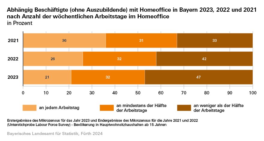 Nach Angaben des Bayerischen Landesamts für Statistik arbeiten im Jahr 2023 insgesamt rund 1,5 Millionen der knapp 6,3 Millionen abhängig Beschäftigten in Bayern mindestens einen Tag in der Woche von zu Hause aus. Bei Männern beträgt der Anteil 25 Prozent, bei Frauen sind es rund 22 Prozent. Der Anteil der Beschäftigten, die jeden Tag von zu Hause aus arbeiten, ist dabei weiter rückläufig. Während das im Jahr 2021 sicherlich auch bedingt durch die Corona-Pandemie auf 36 Prozent der Beschäftigten mit Homeoffice zutraf, sind es 2023 noch 21 Prozent.