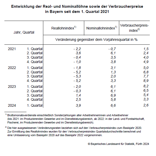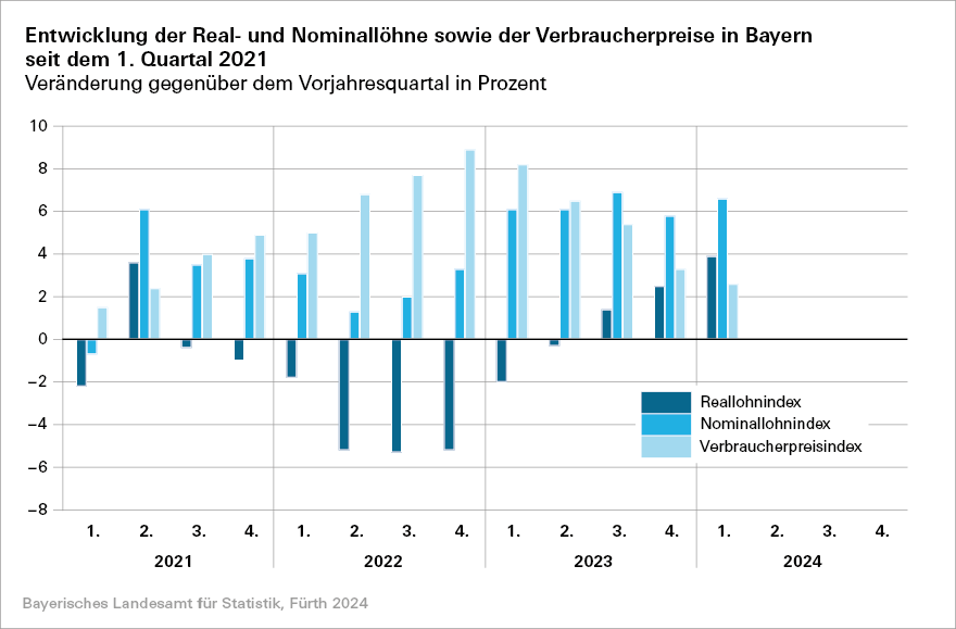 Fürth. Die Nominallöhne der Arbeitnehmerinnen und Arbeitnehmer in Bayern steigen im ersten Quartal 2024 um durchschnittlich 6,6 Prozent gegenüber dem Vorjahresquartal. Dies ist der zweithöchste Nominallohnzuwachs für die bayerischen Beschäftigten seit Beginn der Zeitreihe im Jahr 2008. Die Verbraucherpreise nehmen im ersten Quartal 2024 im Vergleich zum ersten Quartal des Vorjahres um 2,6 Prozent zu. Wie das Fachteam im Bayerischen Landesamt für Statistik weiter mitteilt, errechnet sich für die Reallöhne im Freistaat im ersten Quartal 2024 ein Zuwachs um 3,9 Prozent. Das ist der stärkste Anstieg der realen Verdienste in einem Berichtsquartal seit Beginn der Zeitreihe 2008.