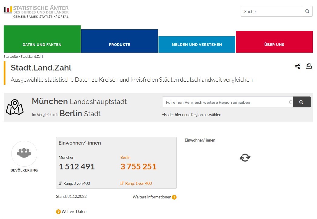 Diese und weitere Vergleiche statistischer Ergebnisse ermöglicht die Anwendung „Stadt.Land.Zahl“ der Statistischen Ämter des Bundes und der Länder im Statistikportal. Auf einen Blick lassen sich Daten für alle Kreise und kreisfreien Städte Deutschlands zu Themen wie Bevölkerung, Tourismus, Wirtschaft oder Umwelt bis zum Jahr 2022 vergleichen.