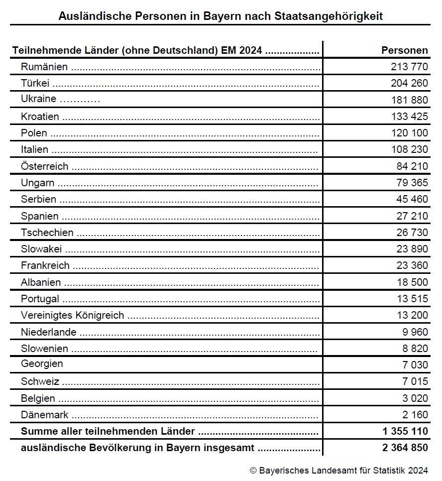 Fürth. Nach Angaben des Bayerischen Landesamts für Statistik leben in Bayern zum Stichtag 31.12.2023 insgesamt 2 364 850 ausländische Personen, darunter 1 355 110 Personen mit einer Staatsangehörigkeit einer der insgesamt 23 ausländischen Mannschaften der Fußball-Europameisterschaft 2024. Den größten Anteil an der ausländischen Bevölkerung in Bayern bilden mit 213 770 die Rumäninnen und Rumänen.