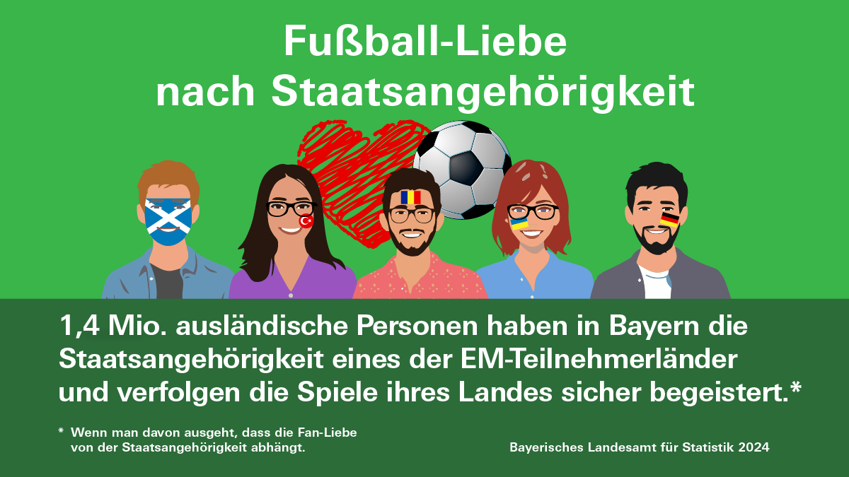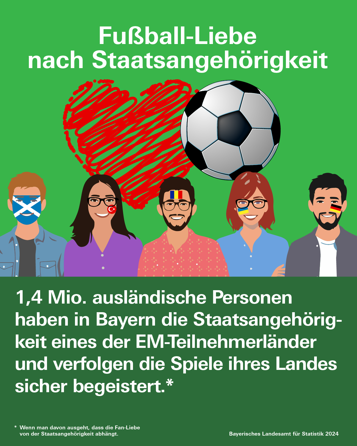 Im Zeitraum vom 14. Juni bis 14. Juli 2024 findet in Deutschland die Fußball-Europameisterschaft statt. In Bayern werden die Fans bei diesem sportlichen Großereignis nicht nur mit der deutschen Mannschaft mitfiebern, sondern auch mit den anderen 23 Teams, die teilnehmen. Ausgehend davon, dass die Fan-Liebe nach Staatsangehörigkeit ausgewertet wird, ergibt sich für die im Freistaat lebenden 1,36 Millionen ausländischen Personen folgendes Bild: Die stärkste Fangemeinde nach Einwohnerzahl hat Rumänien mit 213 770 Personen. Aber auch Personen aus Dänemark, die aus dem Teilnehmerkreis mit 2 160 Personen die wenigsten Einwohner in Bayern haben, feuern ihre Nationalmannschaft bestimmt mit gleicher Begeisterung an.