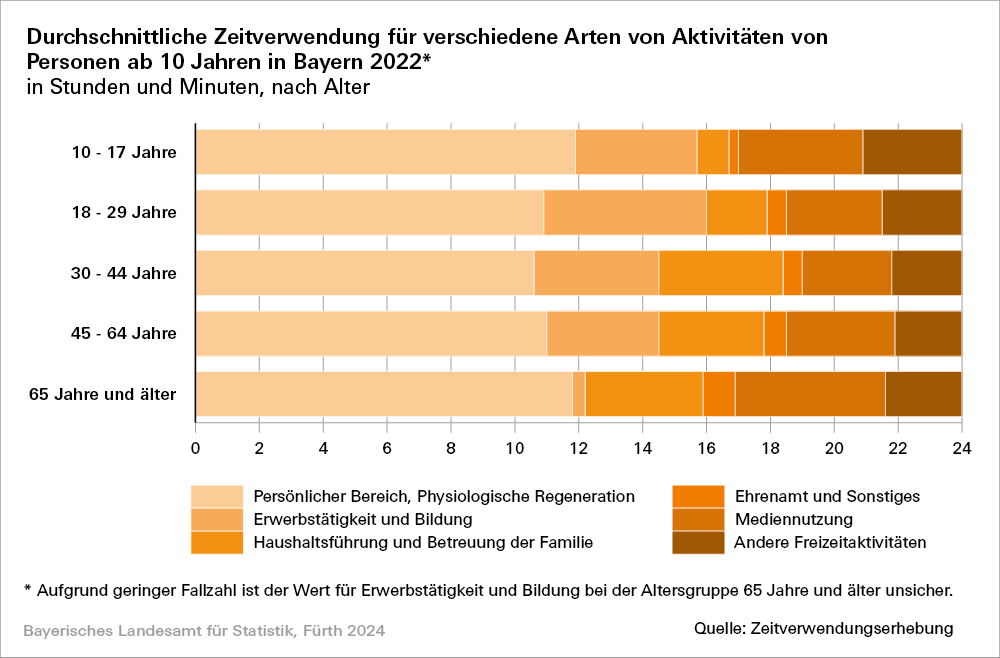 Fürth. Im Pressebriefing am 19.07.2024 stellt die Expertin des Bayerischen Landesamts für Statistik, Dr. Sophie Hahn, die aktuellen Ergebnisse der Zeitverwendungserhebung 2022 für Bayern vor. Insbesondere die Mediennutzung in der bayerischen Bevölkerung steht im Fokus. Im Durchschnitt verwenden die Bayern (ab 10 Jahren) täglich gut 11 Stunden für Schlafen, Essen und Waschen, gut drei Stunden für Erwerbstätigkeit und Ausbildung, ähnlich viel Zeit für Haushaltsführung und Betreuung der Familie, etwa dreieinhalb Stunden für Mediennutzung in der Freizeit, weitere zwei Stunden und 20 Minuten für andere Freizeitaktivitäten und etwa 40 Minuten für sonstige Tätigkeiten (darunter auch Ehrenamt). Die Ergebnisse zeigen, dass sich die Zeiteinteilung für verschiedene Aktivitäten nach Altersgruppen unterscheidet. In den mittleren Altersgruppen zwischen 18 und 65 Jahren nehmen Erwerbsarbeit und Ausbildung sowie Haushaltsführung und Betreuung der Familie besonders viel Zeit ein. Die 10- bis 17-Jährigen und Personen ab 65 geben dagegen der Freizeit mehr Raum.