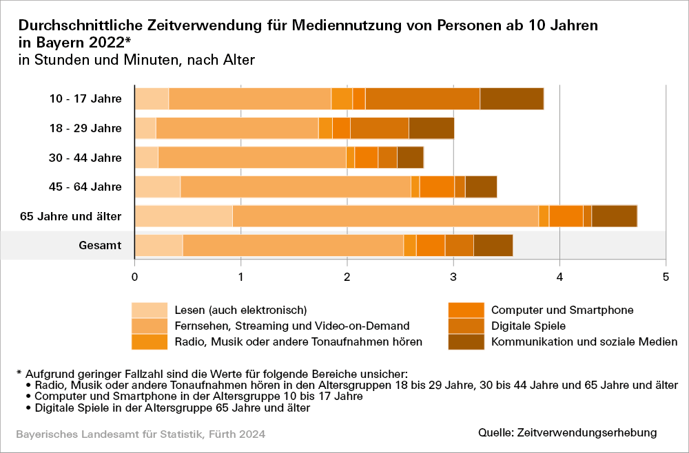 Wie das Bayerische Landesamt für Statistik mitteilt, nutzen Menschen in Bayern ab zehn Jahren im Jahr 2022 durchschnittlich 3,5 Stunden pro Tag in ihrer Freizeit unterschiedliche Medien. Fernsehen macht zusammen mit Streaming und Video-on-Demand den größten Anteil aus. Der Medien-Mix unterscheidet sich je nach Altersgruppe: Jüngere bevorzugen digitale Spiele, während das Lesen als Freizeitbeschäftigung in den höheren Altersgruppen an Bedeutung gewinnt.