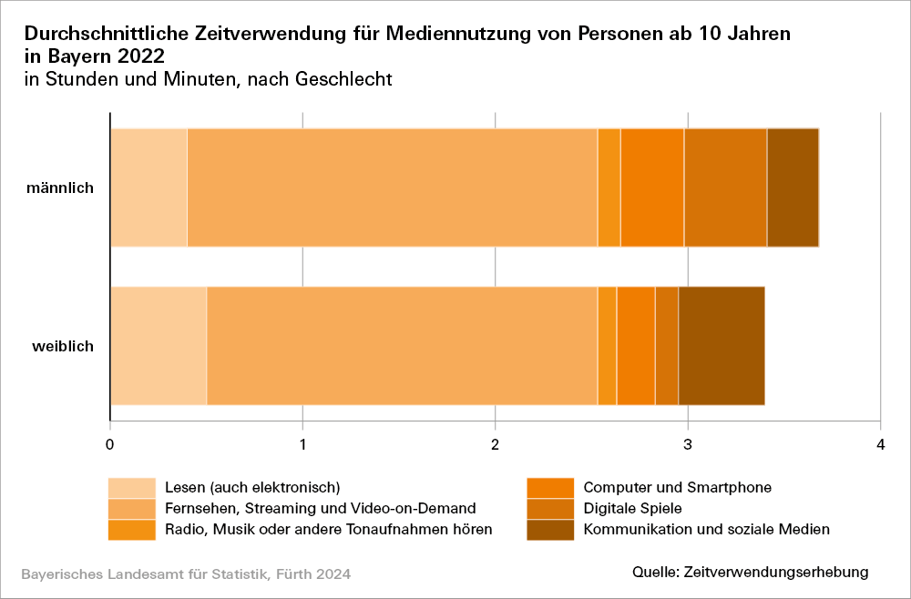 Insgesamt beschäftigen sich die Menschen in Bayern im Jahr 2022 täglich durchschnittlich etwa dreieinhalb Stunden (3 Stunden und 32 Minuten) vorrangig damit, fernzusehen, zu lesen, Radio zu hören, Computer und Smartphone zu nutzen, digitale Spiele zu spielen oder über Medien mit anderen zu kommunizieren (via Telefon, E-Mails und Briefen oder sozialen Medien).