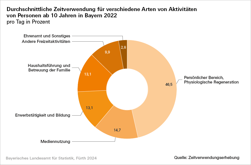 Die Zeitverwendungserhebung ist eine freiwillige bundesweite Erhebung, die alle zehn Jahre von den Statistischen Ämtern des Bundes und der Länder durchgeführt wird. Sie liefert Erkenntnisse, wie viel Zeit Menschen in Deutschland für die verschiedenen Lebensbereiche verwenden. Die Daten sind unter anderem eine wichtige Grundlage, um Maßnahmen zur besseren Vereinbarkeit von Familie und Beruf vorzubereiten und zu bewerten. Aufgrund der Erhöhung der Stichprobe können zum ersten Mal für das Jahr 2022 nicht nur bundesweite Ergebnisse, sondern auch Ergebnisse zur bayerischen Bevölkerung veröffentlicht werden.