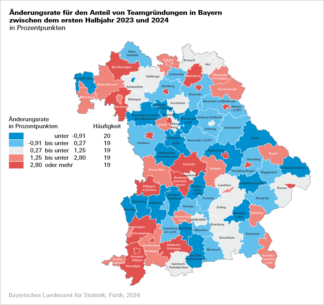Deutlicher fällt die Zunahme bei Neugründungen aus, an denen aufgrund der gewählten Rechtsform1) mehrere Gewerbetreibende beteiligt sind. Gegenüber dem Halbjahr des Vorjahres steigt der Anteil an Teamgründungen bayernweit um 0,8 Prozentpunkte. In mehr als zwei Dritteln aller Landkreise und kreisfreien Städte nimmt die Anzahl solcher Teamgründungen zu. In der Kartendarstellung lässt sich das obere Fünftel der Landkreise und kreisfreien Städte Bayerns mit einer besonders deutlichen Zunahme von Teamgründungen erkennen. Dazu zählen 10 kreisfreie Städte, darunter auch die kreisfreie Stadt Fürth.