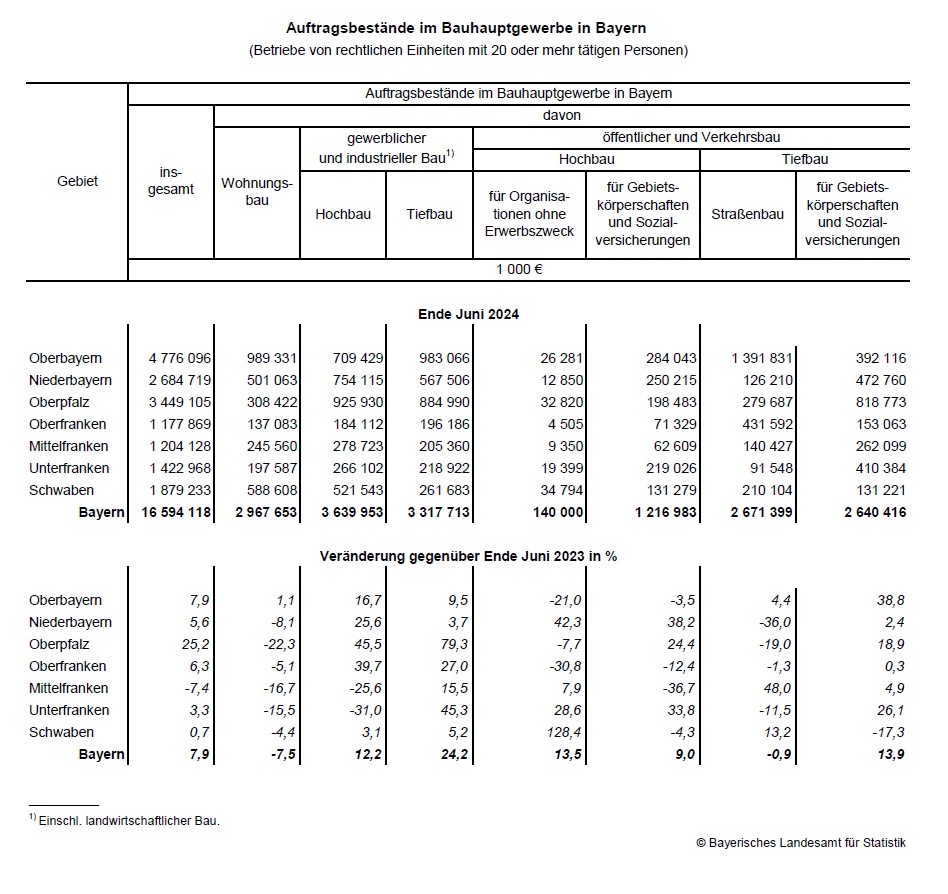 Bayerns Bauhauptgewerbe Ende Juni 2024 mit Auftragsbestand im Wert von 16,59 Milliarden Euro