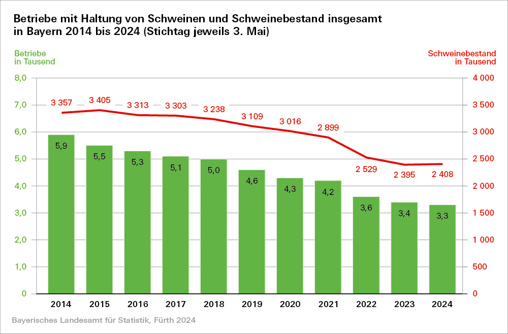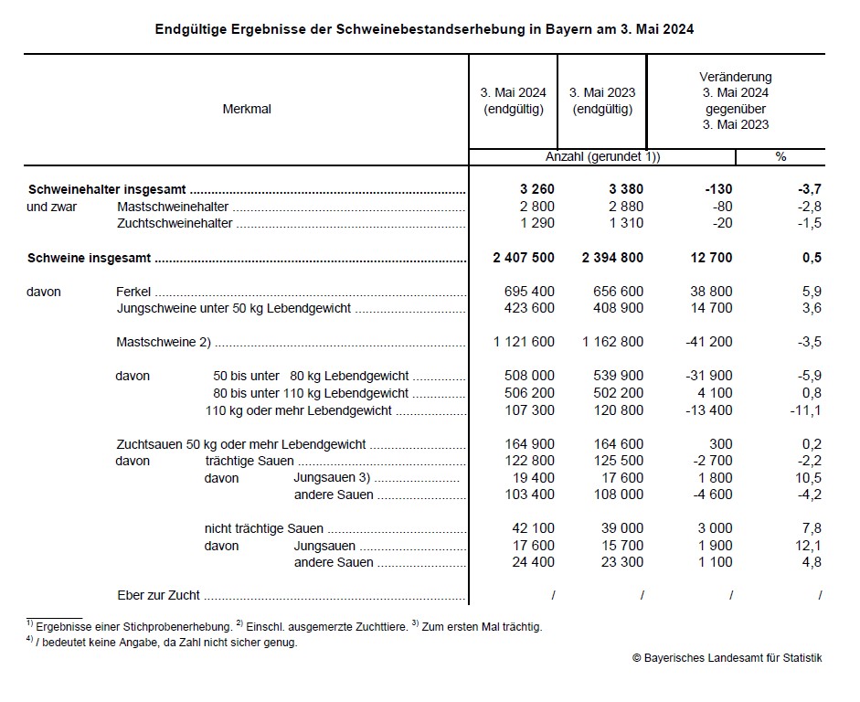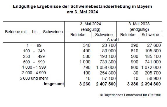 Nach den endgültigen Ergebnissen der vom Landesamt für Statistik durchgeführten Erhebung über die Schweinebestände zum Stichtag 3. Mai 2024 werden in Bayern insgesamt 2 407 500 Schweine gehalten.