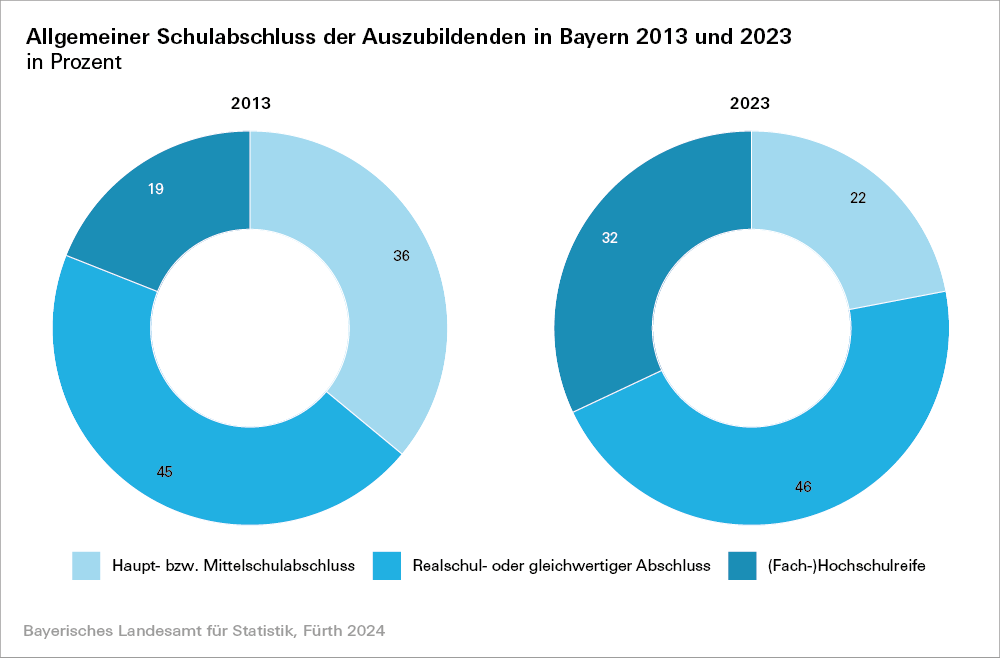 Damit geht auch ein Anstieg des allgemeinen Bildungsniveaus der Auszubildenden einher. Vor 10 Jahren verfügten mehr als ein Drittel der Auszubildenden mit allgemeinem Schulabschluss über einen Haupt- oder Mittelschulabschluss (36 Prozent), 45 Prozent hatten die Schule mit der mittleren Reife abgeschlossen und 19 Prozent hatten die (Fach-)Hochschulreife erworben. 2023 zeigt sich hier ein anderes Bild. Nur noch 22 Prozent der bayerischen Auszubildenden geben einen Haupt- bzw. Mittelschulabschluss als höchsten allgemeinen Schulabschluss an, gut 45 Prozent haben die Realschule abgeschlossen und sogar 32 Prozent haben