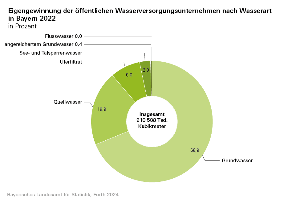 Die Basis der öffentlichen Wasserversorgung in Bayern sind Grundwasservorkommen, aus denen bayerische Wasserversorgungsunternehmen 627 Millionen Kubikmeter im Jahr 2022 entnehmen. Damit hat Grundwasser einen Anteil von 68,9 % an deren gesamten Eigengewinnung von 911 Millionen Kubikmeter. Regional unterscheidet sich die Bedeutung von Grundwasser deutlich. Während die Wasserversorger in der Oberpfalz 84,5 % des gesamten Trinkwassers aus diesem gewinnen, sind es in Mittelfranken nur 55,2 %.