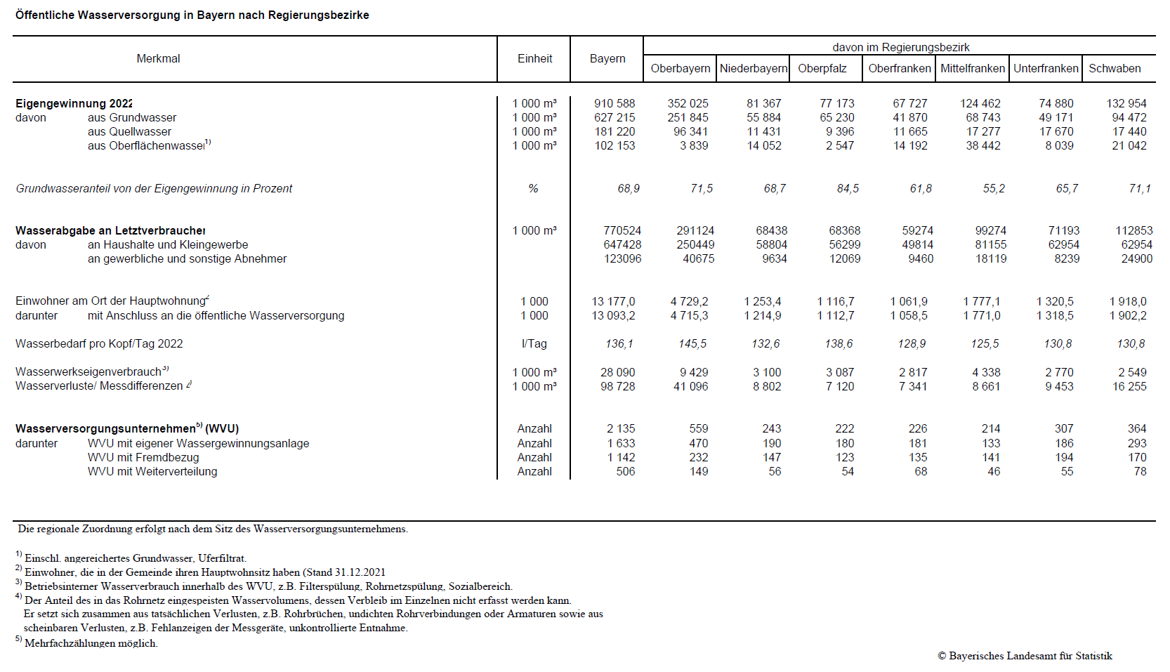 Seit der letzten Erhebung der öffentlichen Wasserversorgung im Jahr 2019 nimmt der tägliche Trinkwasserverbrauch pro Kopf um 2 Liter auf 136,1 Liter zu. Regional variiert der Trinkwasserverbrauch zwischen 145,5 Liter in Oberbayern und 125,5 Liter in Mittelfranken.