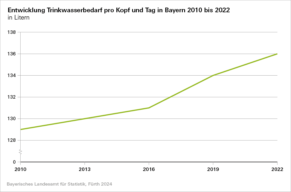 Der Trinkwasserbedarf der privaten Haushalte und der Wirtschaft liegt in Bayern 2022 bei rund 771 Millionen Kubikmeter. Beinahe alle Einwohnerinnen und Einwohner im Land - 2022 sind es 13,1 Millionen - sind an das öffentliche Netz angeschlossen. Private Haushalte (einschl. Kleingewerbe) verbrauchen 2022 gut fünf Sechstel des Trinkwassers (647 Millionen Kubikmeter). Daraus leitet sich ein Wasserbedarf pro Kopf von 136,1 Liter am Tag ab. Das sind 2 Liter mehr als 2019. Im Vergleich zu 2010, dem Jahr mit dem geringsten Pro-Kopf-Wert, liegt der Verbrauch um 7,1 Liter höher. Es liegt nahe, dass der Klimawandel mit den wärmeren und niederschlagsärmeren Sommern der letzten Jahre diesen Mehrbedarf erklärt. In den Erhebungsjahren bis einschließlich 1991 lag der Pro-Kopf-Wasserbedarf noch bei 130 bis