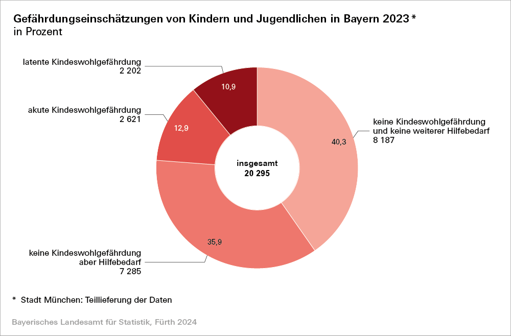 Die Bayerischen Jugendämter melden im Jahr 2023 insgesamt 20 295 Gefährdungseinschätzungen. Nach Angaben des Bayerischen Landesamts für Statistik liegt in 2 621 Fällen eine akute und in 2 202 Fällen eine latente Kindeswohlgefährdung vor. Bei 7 285 Gefährdungseinschätzungen wird keine Kindeswohlgefährdung, jedoch Hilfebedarf festgestellt. In 8 187 Fällen wird weder eine Kindeswohlgefährdung noch weiterer Hilfebedarf ermittelt.