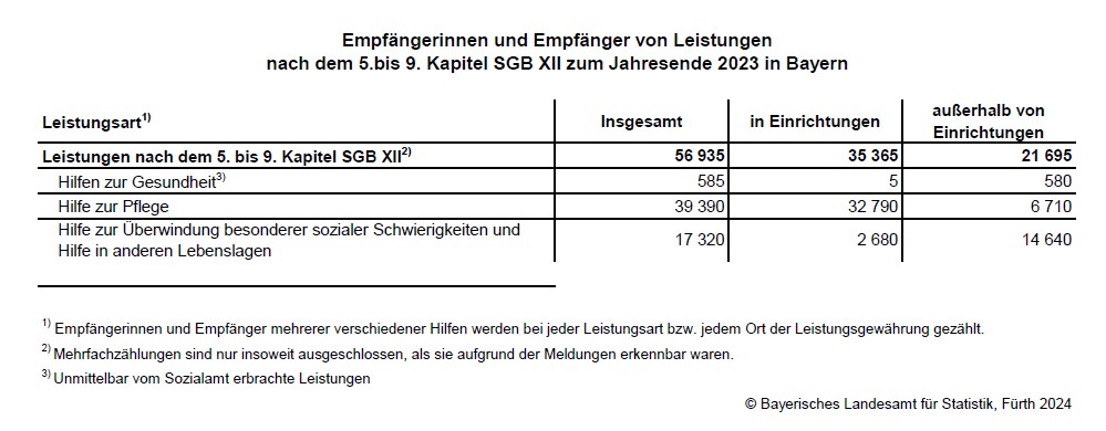 Nach Angaben des Bayerischen Landesamts für Statistik erhalten am Stichtag 31.12.2023 bayernweit 56 935 Personen Hilfeleistungen in besonderen Lebenslagen nach dem 5. bis 9. Kapitel SGB XII. Zu rund 62 Prozent werden die Leistungen in Einrichtungen erbracht. Hilfe zur Pflege stellt mit 39 390 Empfängerinnen und Empfängern den größten Leistungsblock dar.