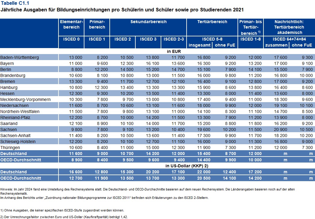 Laut Indikator zu Finanzressourcen liegen im Jahr 2021 die Ausgaben des Freistaats für Bildungseinrichtungen von der Grundschule bis zum beruflichen Abschluss pro Kopf bei 13 200 Euro. Diese Investitionen sind damit erkennbar höher als der bundesweite Mittelwert von 12 000 Euro sowie deutlich über dem Durchschnitt von 10 000 Euro in der OECD. Allein im Tertiärbereich investiert Bayern rechnerisch 16 300 Euro pro Kopf. Der Bundesdurchschnitt beträgt hingegen 15 400 Euro, der OECD- Durchschnitt lediglich 14 400 Euro.