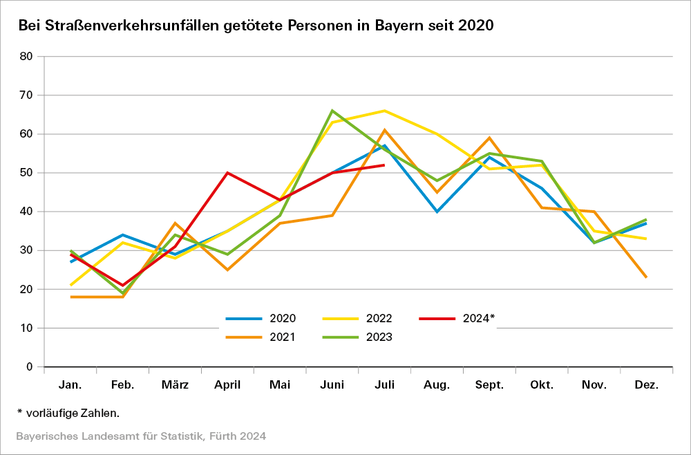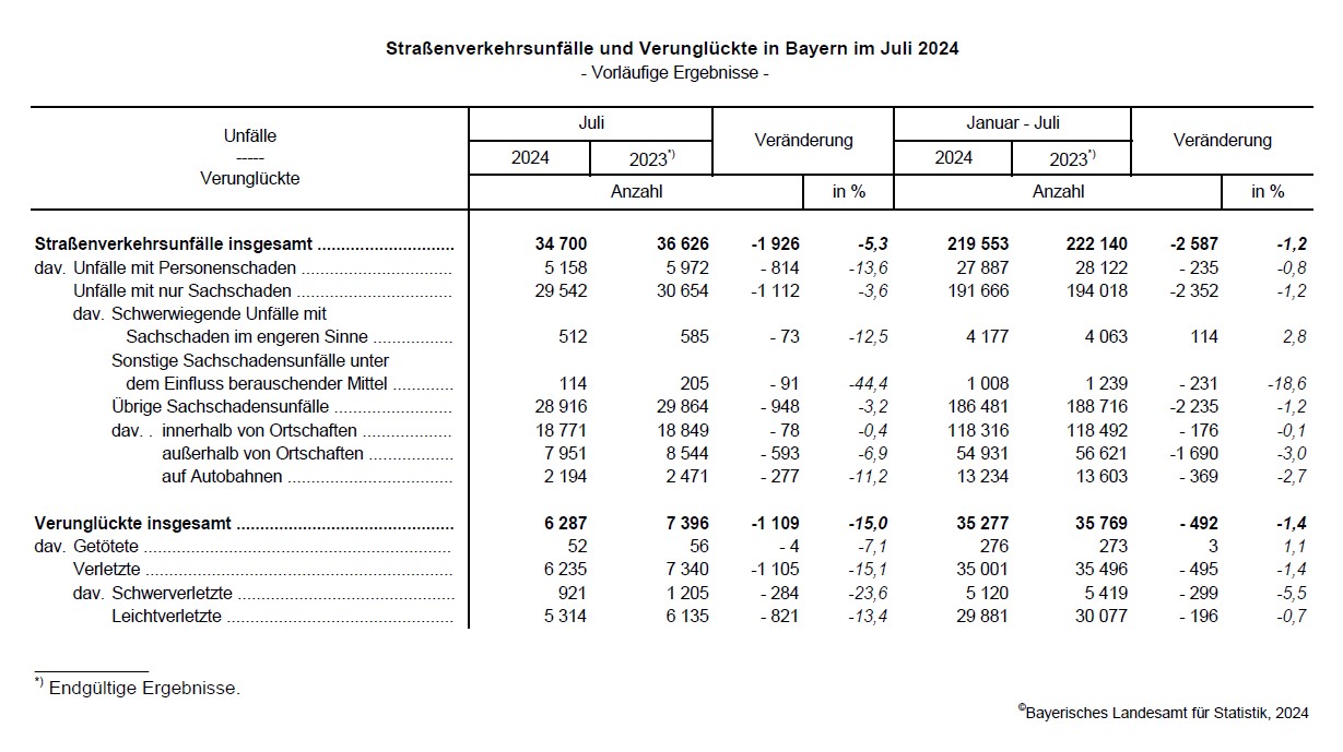 Im Juli 2024 ereigneten sich auf Bayerns Straßen nach den vorläufigen Meldungen der Polizei insgesamt 34 700 Unfälle und somit 5,3 Prozent weniger als im Vorjahresmonat. Nach Mitteilung des Bayerischen Landesamts für Statistik verunglückten dabei 6 287 Verkehrsteilnehmer insgesamt, 15,0 Prozent weniger als im Juli 2023. Es wurden 52 Menschen getötet (-7,1 Prozent), 921 schwer (-23,6 Prozent) und 5 314 leicht verletzt (-13,4 Prozent).