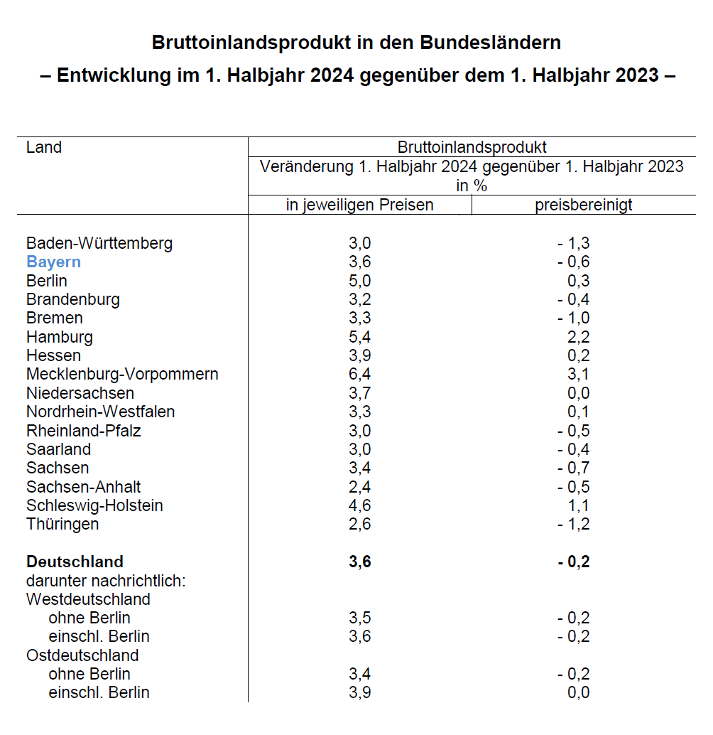 Die bayerische Gesamtwirtschaft wächst im ersten Halbjahr 2024 nur noch nominal um 3,6 Prozent. Damit liegt die Bayerische Wirtschaft bei nominaler Betrachtung im bundesweiten Durchschnitt. Bereinigt um die Preisentwicklung zeigt sich in Bayern jedoch ein leichtes Minus von 0,6 Prozent. Nach Mitteilung des Bayerischen Landesamts für Statistik geht die Wirtschaftsleistung in Bayern damit etwas stärker zurück als in Deutschland insgesamt, dessen Wirtschaft im ersten Halbjahr des laufenden Jahres real um 0,2 Prozent schrumpft.