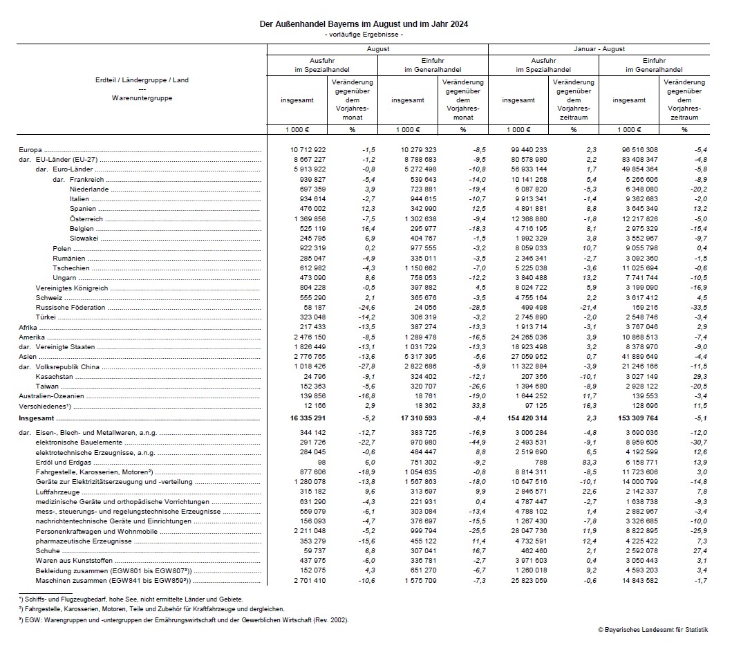 Wie das Bayerische Landesamt für Statistik nach den vorläufigen Ergebnissen zur Außenhandelsstatistik mitteilt, nehmen die Exporte der bayerischen Wirtschaft im August 2024 gegenüber dem August 2023 um 5,2 Prozent auf 16,3 Milliarden Euro ab. Unterdessen sinken die Importe um 8,4 Prozent auf 17,3 Milliarden Euro. – In den ersten acht Monaten 2024 steigen die Exporte gegenüber dem Vorjahreszeitraum um 2,3 Prozent auf 154,4 Milliarden Euro, die Importe gehen allerdings um 5,1 Prozent auf 153,3 Milliarden Euro zurück.