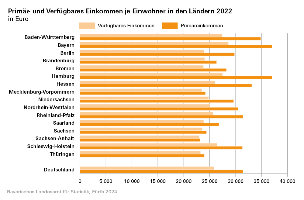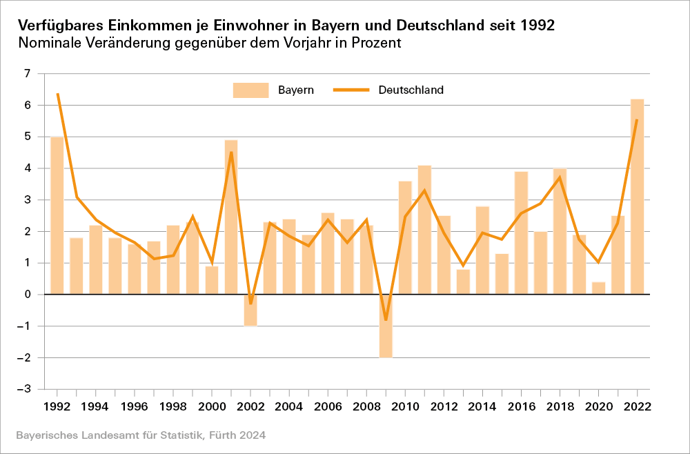 Nach Meldung des Bayerischen Landesamts für Statistik hatten private Haushalte in Bayern im Jahr 2022 durchschnittlich 28 643 Euro (alt: 28 469 Euro) je Einwohner für Konsum und Sparen zur Verfügung. Dies ist der höchste Wert unter allen Ländern. Mit einem Zuwachs um 6,2 Prozent (alt: 5,5 Prozent) ist das Verfügbare Pro-Kopf-Einkommen in Bayern zudem 2022 nominal so stark gestiegen wie seit 1991 nicht mehr. Real mussten die Haushalte in Bayern dennoch Kaufkraftverluste hinnehmen, da die Inflation mit 7,1 Prozent im Jahr 2022 den Einkommenszuwachs übertraf.