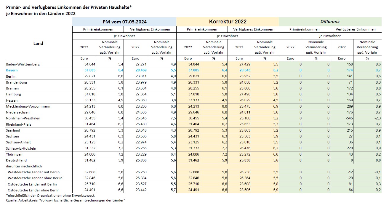 Das Verfügbare Einkommen der privaten Haushalte musste für das Berichtsjahr 2022 neu berechnet werden. In der Pressemeldung vom 07.05.2024 mit der Nr. 117/2024/32/P wurden daher an zwei Stellen die Werte für Bayern korrigiert. Und in den anhängenden Tabellen auch für die anderen Länder angepasst. Die korrigierten Werte sind gekennzeichnet.