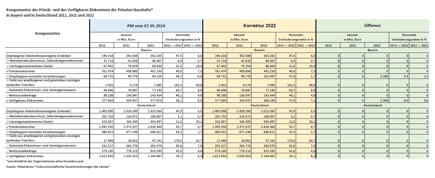 Korrektur zur PM 117 vom 07.05.2024: Verfügbares Einkommen je Einwohner in Bayern im Jahr 2022 so stark gestiegen wie seit Langem nicht – dennoch reale Kaufkraftverluste wegen der hohen Inflation