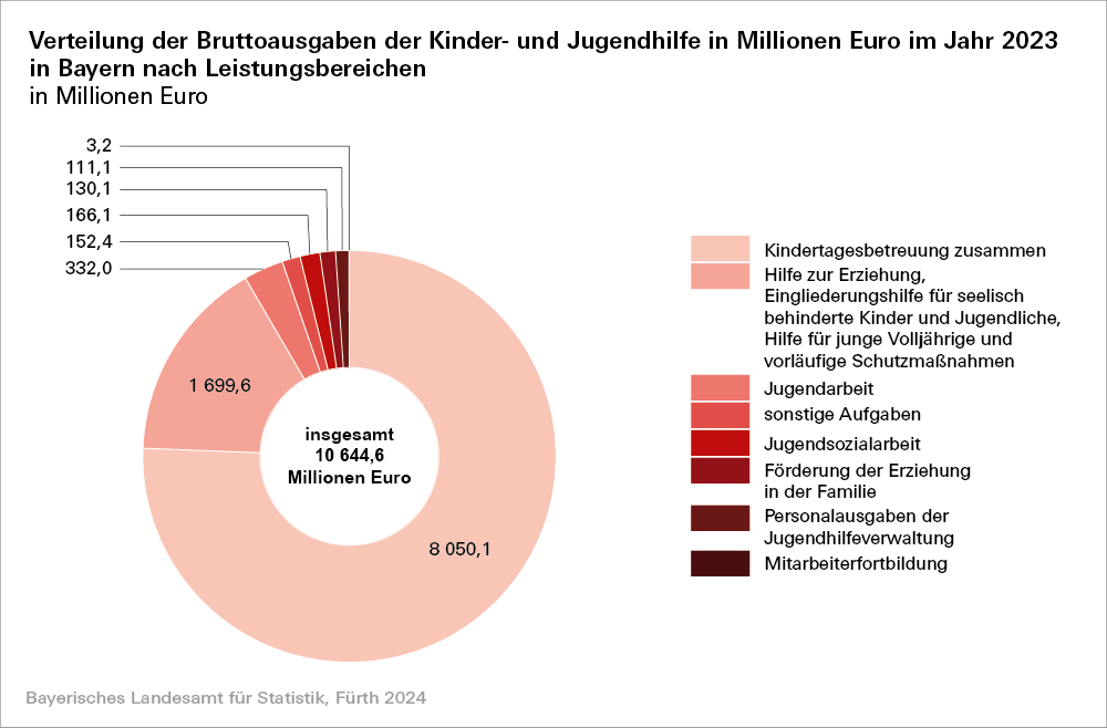 Von den Bruttoausgaben sind Aufwendungen für Kindertagesbetreuung mit 8 050 Millionen Euro der größte Posten. Die Ausgaben hierfür liegen 8,2 Prozent über denen des Vorjahres (7 440 Millionen Euro). Zweitgrößter Posten sind Ausgaben für Hilfe zur Erziehung, Eingliederungshilfe für seelisch behinderte Kinder und Jugendliche, Hilfe für junge Volljährige und vorläufige Schutzmaßnahmen. Diese liegen mit rund 1 700 Millionen Euro ebenfalls über dem Vorjahresniveau (1 505 Millionen Euro).