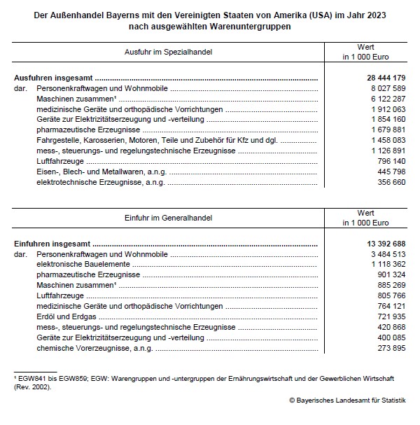 Bayerns Außenhandel mit den USA im Jahr 2023: Ausfuhren bei 28,4 Milliarden Euro, Einfuhren bei 13,4 Milliarden Euro