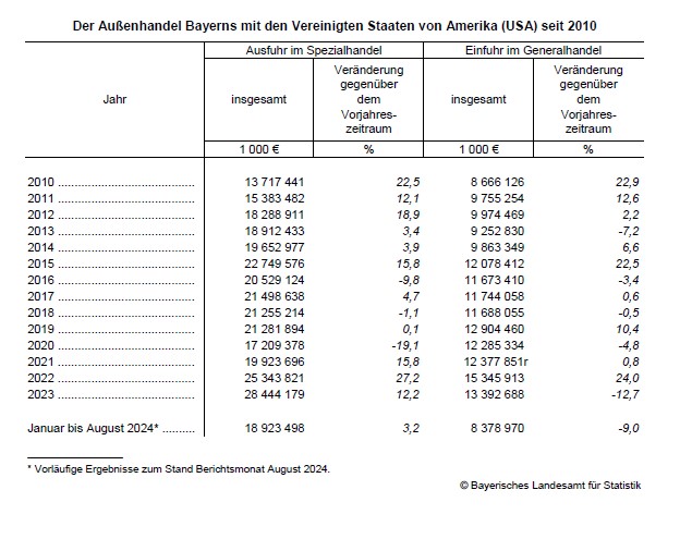 In den ersten acht Monaten 2024¹ steigen die Exporte der bayerischen Wirtschaft in die USA gegenüber dem Vorjahreszeitraum um 3,2 Prozent auf 18,9 Milliarden Euro. Die US-amerikanischen Importe nach Bayern gehen hingegen um 9,0 Prozent auf 8,4 Milliarden Euro zurück. (vgl. hierzu auch die Pressemeldung vom 24.9.24: https://statistik.bayern.de/presse/mitteilungen/2024/pm278/index.html)