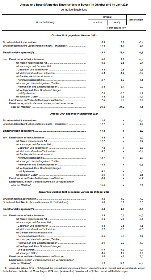 Nach einer Mitteilung des Bayerischen Landesamts für Statistik wächst der Umsatz im bayerischen Einzelhandel (ohne Kraftfahrzeughandel) im Oktober 2024 im Vergleich zum Oktober 2023 nach vorläufigen Ergebnissen nominal und real um 12,1 Prozent. Aufgrund der Umstrukturierung eines größeren Unternehmens im Internet- und Versandhandel¹ weisen die betroffenen Zeitreihen ab Monat August 2024 einen (strukturellen) Zuwachs auf. Die Beschäftigtenzahl im Einzelhandel geht im Oktober 2024 um 0,9 Prozent zurück.