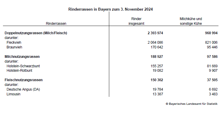 Wie das Bayerische Landesamt für Statistik mitteilt, liegt der Rinderbestand in Bayern zum Stichtag 3. November 2024 bei 2 733 203 Rindern in 38 092 Rinderhaltungen. Im Durchschnitt entfallen damit auf einen Halter knapp 72 Rinder. Den Hauptanteil der bayerischen Rinderbestände machen mit 37,9 Prozent die Milchkühe aus. Gut drei Viertel der in Bayern gehaltenen Rinder gehören der Doppelnutzungsrasse Fleckvieh an.