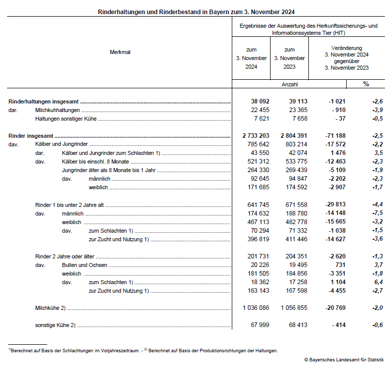 Fürth. In Bayern gibt es zum Stichtag 3. November 2024 insgesamt 2 733 203 Rinder in 38 092 Haltungen. Das zeigt eine Auswertung der Daten des Verwaltungsverfahrens „Herkunftssicherungs- und Informationssystem Tier (HIT)“ durch das Bayerische Landesamt für Statistik. Im Vergleich zum Vorjahr sinkt die Anzahl der Rinderhaltungen um 1 021 Haltungen, dies entspricht einem Rückgang um 2,6 Prozent. Der Rinderbestand verringert sich um 2,5 Prozent oder 71 188 Tiere. Die durchschnittliche Rinderzahl pro Halter liegt unverändert zum Vorjahreswert bei knapp 72 Rindern je Haltung.