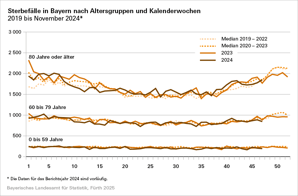 Fürth. Wie das Expertenteam des Bayerischen Landesamts für Statistik nach Auswertung vorläufiger Daten mitteilt, liegt die Zahl an Verstorbenen im Freistaat im November 2024 mit