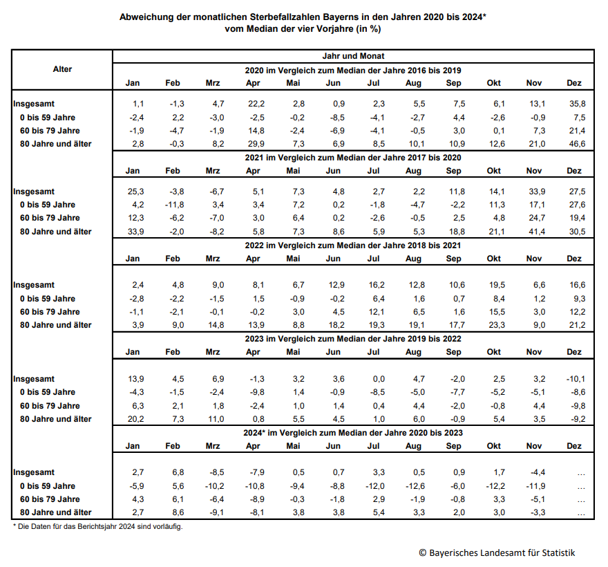 12 209 Personen insgesamt in etwa auf dem Niveau des Medians der Jahre 2020 bis 2023 (12 766 Verstorbene). Dabei ist zu beachten, dass in die Berechnung des Medians der Jahre